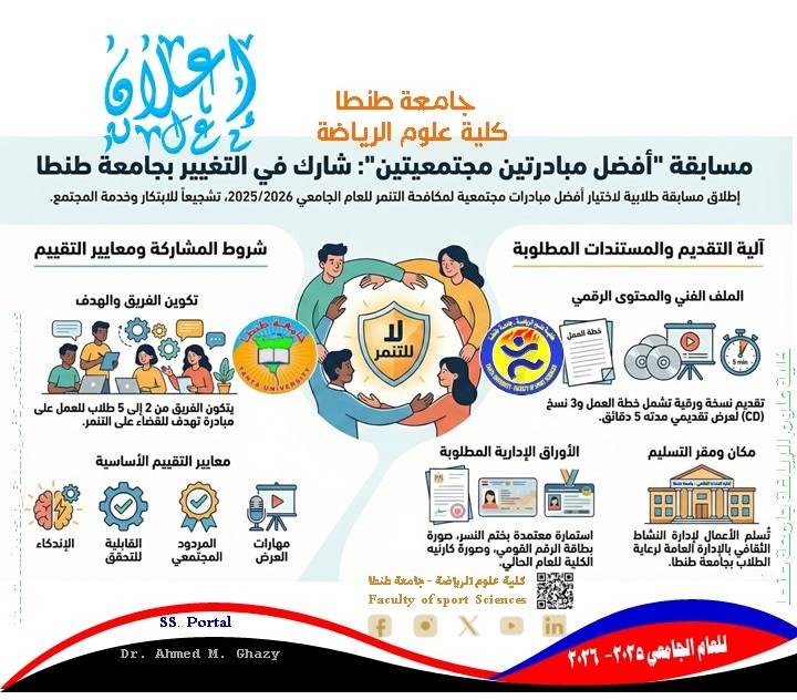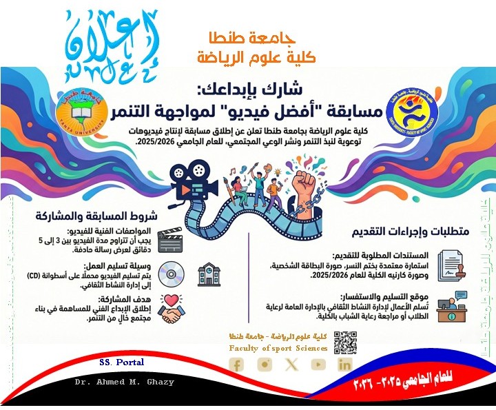 يطيب لى ان أرحب بكم جميعاً والسادة الزائرين للموقع الإلكتروني لكلية علوم الرياضة – جامعة طنطا، والذي يمثل إحدى قنوات التواصل الزاخرة بالمعلومات والبيانات التعليمية والبحثية والخدمية ومنصة لمشاركة الأفكار والمقترحات الفعالة مواكبةً لاحتياجات سوق العمل وتأكيدًا لمكانة الكلية بما يدعم الأداء ويعزز الإبداع والابتكار. مما لا شك فيه أن الطالب هو محور العملية التعليمية وثمرتها وغاية وجودها، وإعداده لمواجهة الحياة وتحدياتها في الحاضر والمستقبل