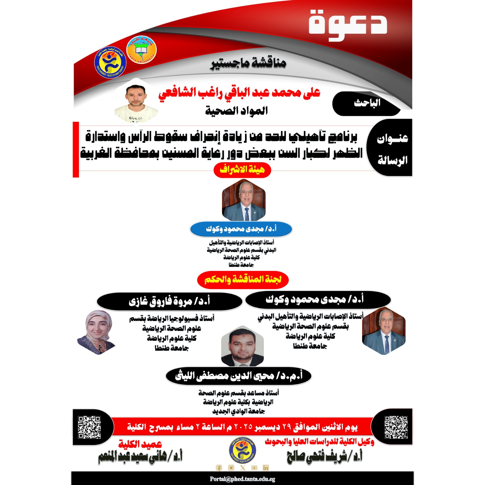 Postgraduate Studies and Scientific Research at Faculty of Sports Science announces holding the discussion of the Master’s Thesis in the specialization of Sports Health Sciences submitted by the researcher/ Ali Mohammed Abdul Baqy Ragheb Al-Shaf’ey. It is held on Monday, December 29th,2025, at 2:00 p.
