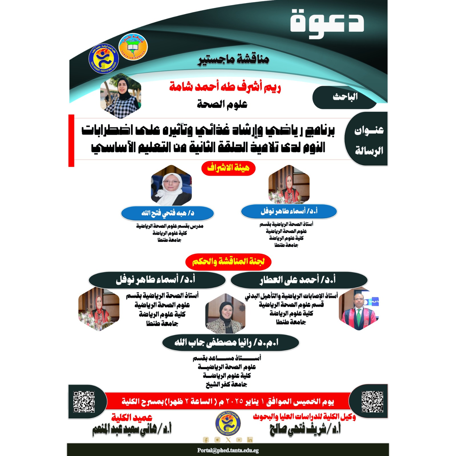 Postgraduate Studies and Scientific Research at Faculty of Sports Science announces holding the discussion of the Master’s Thesis in the specialization of Sports Health Sciences submitted by the researcher/ Reem Ashraf Taha Ahmed Shama. It is held on Thursday, January 1st,2026, at 2:00 p.m. in the facult