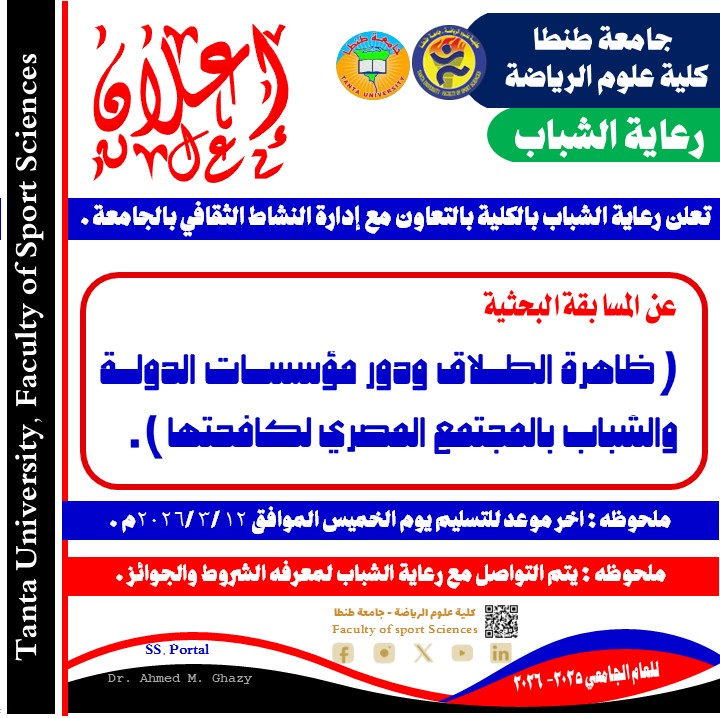 تعلن رعاية الشباب بالكلية بالتعاون مع إدارة النشاط الثقافى بالجامعة وذلك تحت رعاية الاستاذ الدكتور هانى سعيد عبد المنعم عميد الكلية والأستاذ الدكتور أماني البحيرى وكيل الكلية لشئون التعليم والطلاب