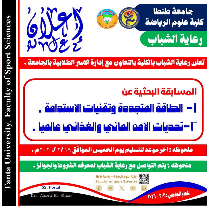 تعلن رعاية الشباب بالكلية بالتعاون مع إدارة الاسر الطلابية بالجامعة وذلك تحت رعاية الاستاذ الدكتور هانى سعيد عبد المنعم عميد الكلية والأستاذ الدكتور أماني البحيرى وكيل الكلية لشئون التعليم والطلاب