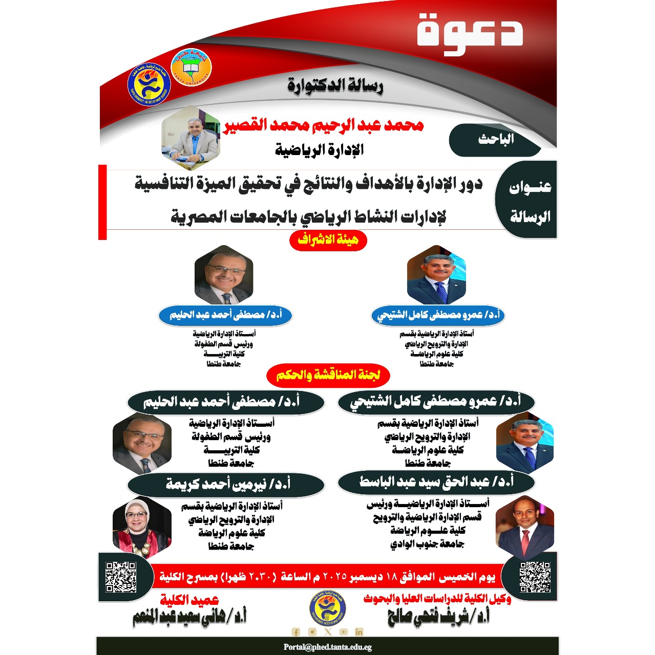 Soutenance publique de la thèse de doctorat soumise par le chercheur/ Mohamed Abdel Rahim Mohamed El-Qasir, le jeudi 18 décembre 2025.